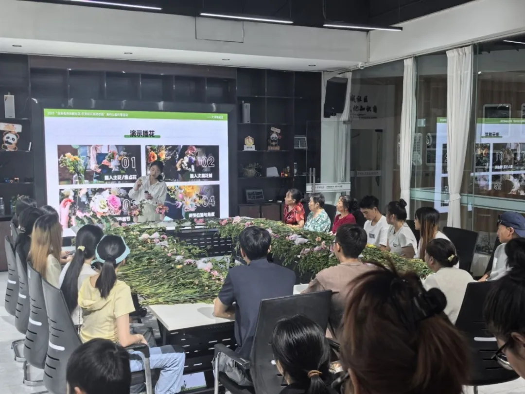 活动现场,创意插花环节成为了众人瞩目的焦点。温江大学城社区特意邀请了专业花艺师亲临指导,为师生们带来一场精彩的花艺知识科普盛宴。花艺师深入浅出地讲解了各类花材的特性、花语寓意以及插花的基本技巧,从花束的色彩搭配,到造型的层次构建,每一个细节都讲解得细致入微。师生们认真聆听,不时提出疑问,现场互动氛围热烈。