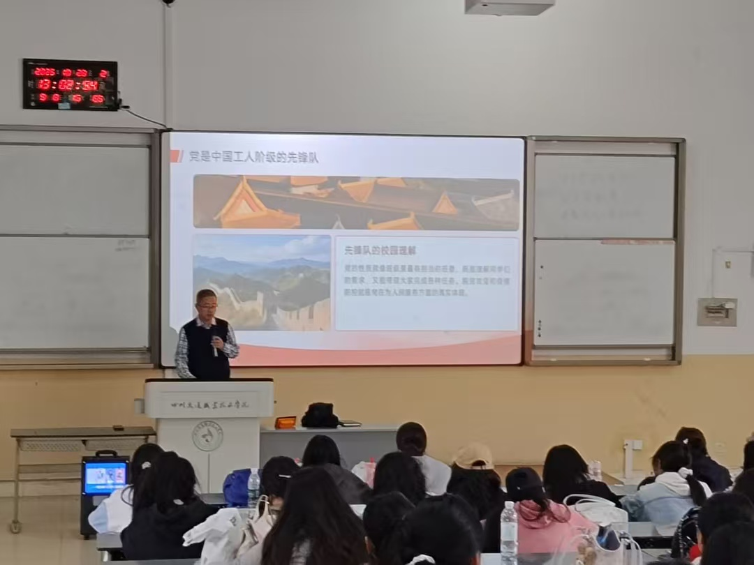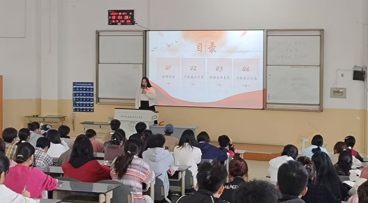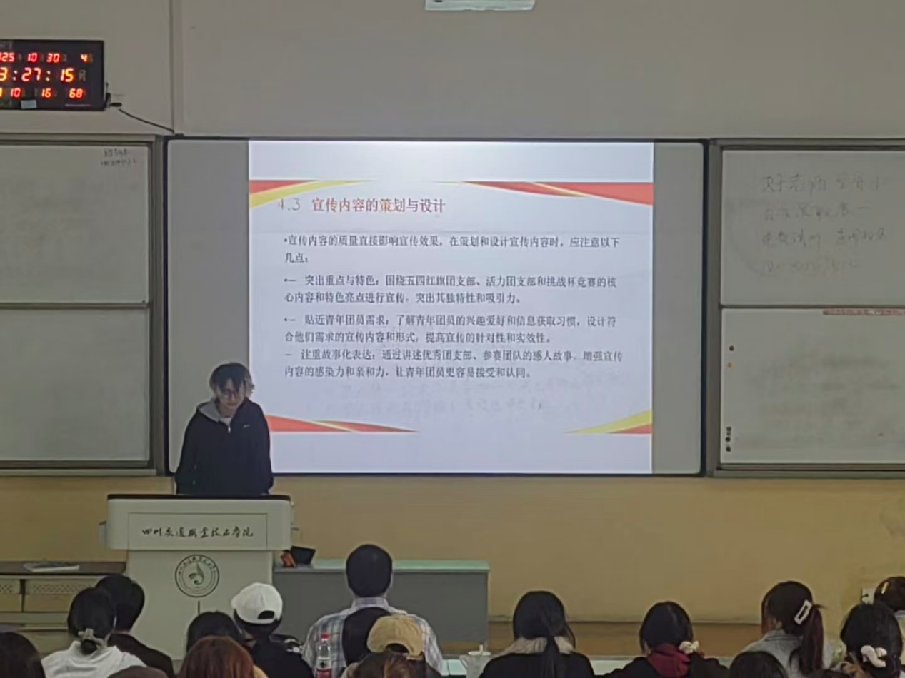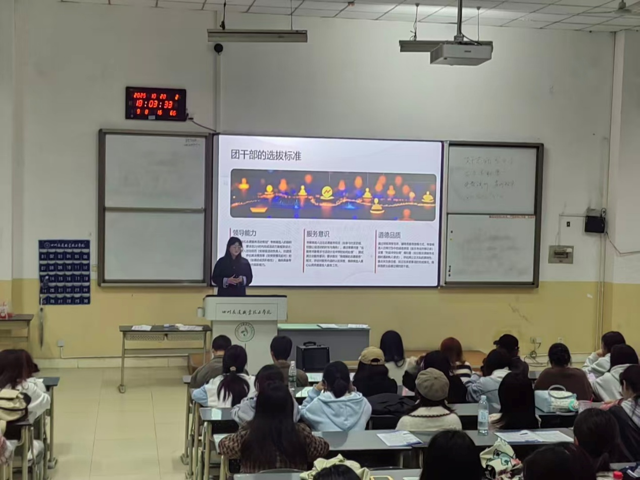系团总支书记杨金兰老师以我院“共青团深化开展推优入党”为主题。介绍共青团深化开展推优入党工作试点实施方案经共青团四川省委研究,确定学院为四川省高校共青团深化开展推优入党工作试点单位。方案以习近平新时代中国特色社会主义思想为指导,深入贯彻党的二十大精神,立足共青团主体责任和立德树人根本任务,加强学生团员教育管理,规范学院共青团推优入党工作程序,真正做到把政治思想上先进、道德品行上先进、发挥作用上先进、执行纪律上先进的优秀团员及时推荐给党组织。