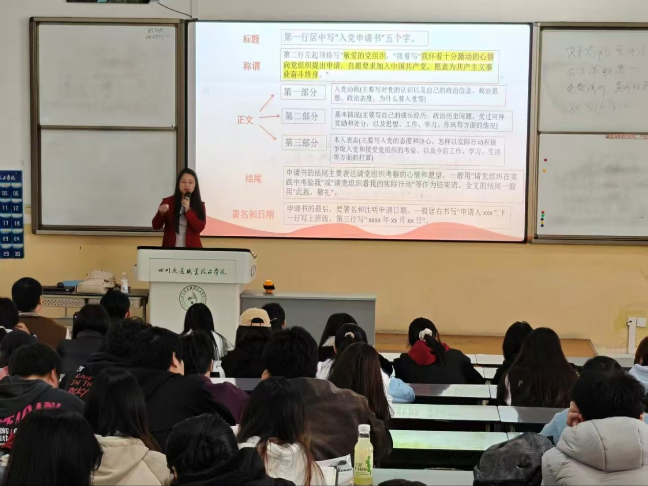 系学生党支部书记邹艳老师强调:党的核心思想是照亮我们前行之路的思想灯塔,是引领我们实现民族复兴的行动纲领。以党的核心思想为指引,坚定理想信念、牢记初心使命、勇于担当作为,在全面建设社会主义现代化国家、实现中华民族伟大复兴中国梦的新征程上,创造出更加辉煌的业绩,让思想之光照亮更多人的奋进之路!同时也为学员们详细讲解了入党申请书的格式、结构、以及相关的要求,为团员同学们书写入党申请书进行了规范培训。